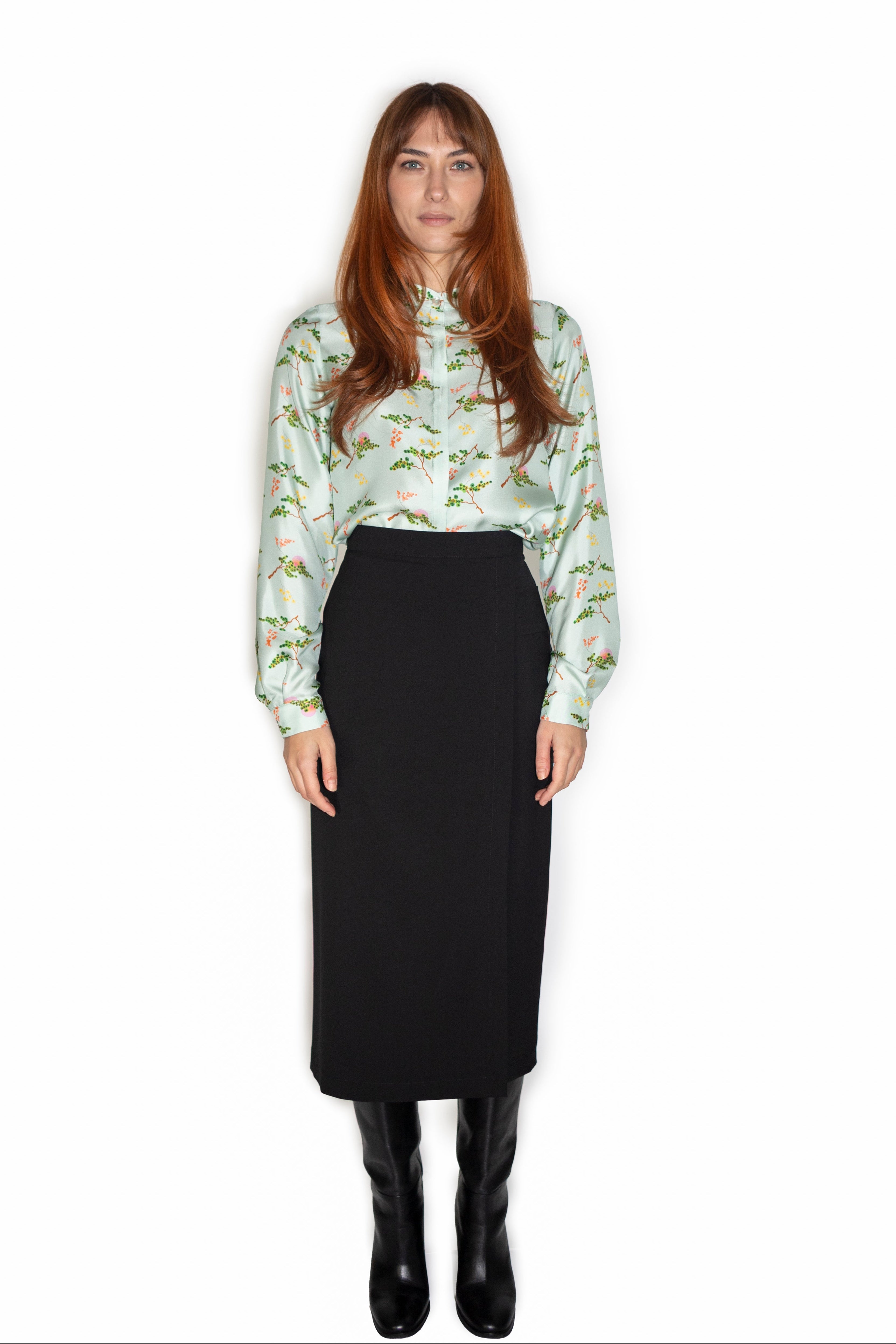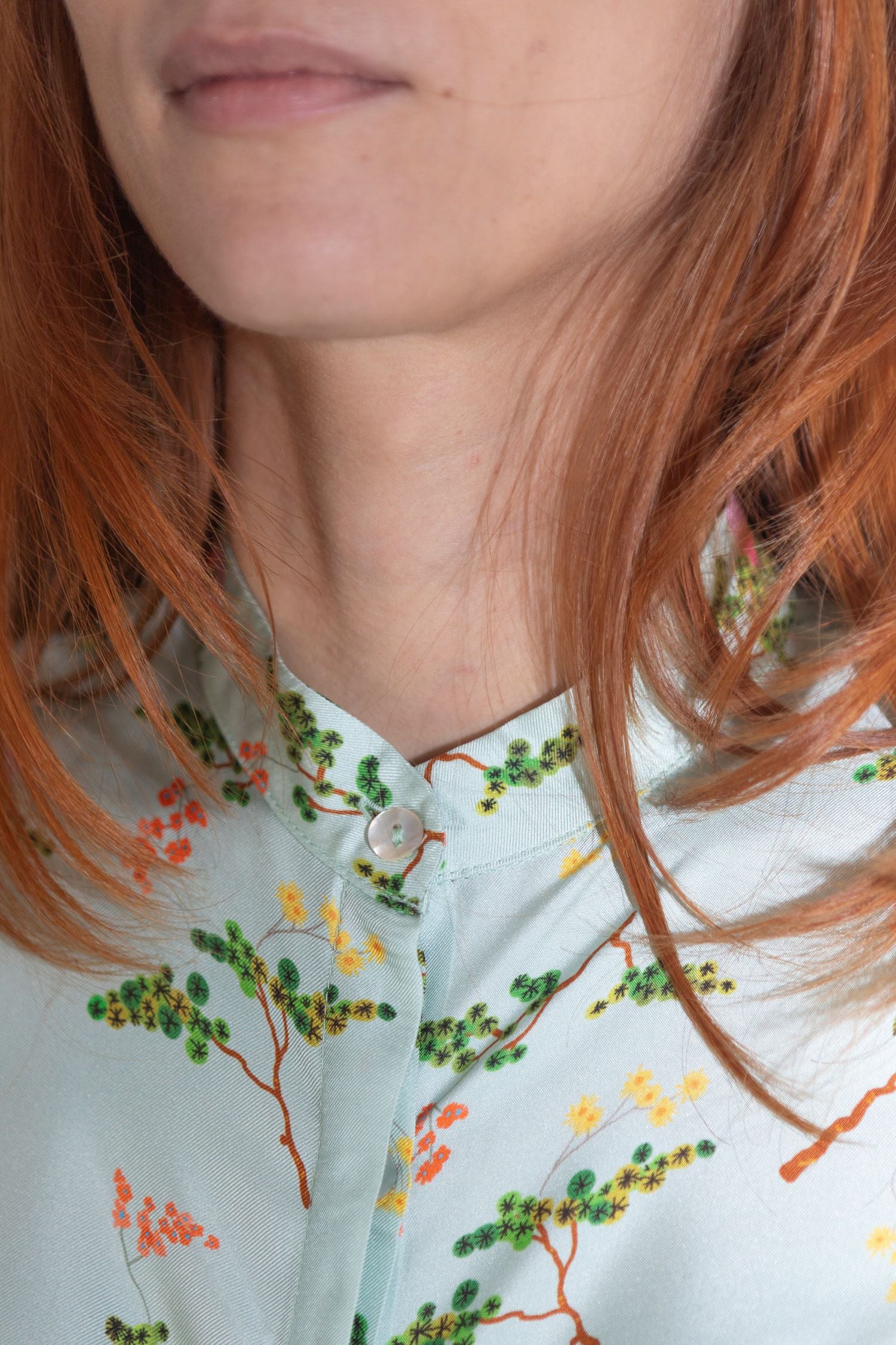 La Camicia Guru è realizzata in twill di pura seta e presenta la fantasia “I pini e la luna”, un disegno originale Paola Bizzi nei toni dell’acquamarina con tocchi di verde e arancio. La stampa trae ispirazione dai giardini giapponesi e dal loro equilibrio tra natura e simbologia poetica. Il tessuto è stampato a Como, cuore della tradizione serica italiana, e ogni camicia è confezionata artigianalmente in Italia in piccole serie.