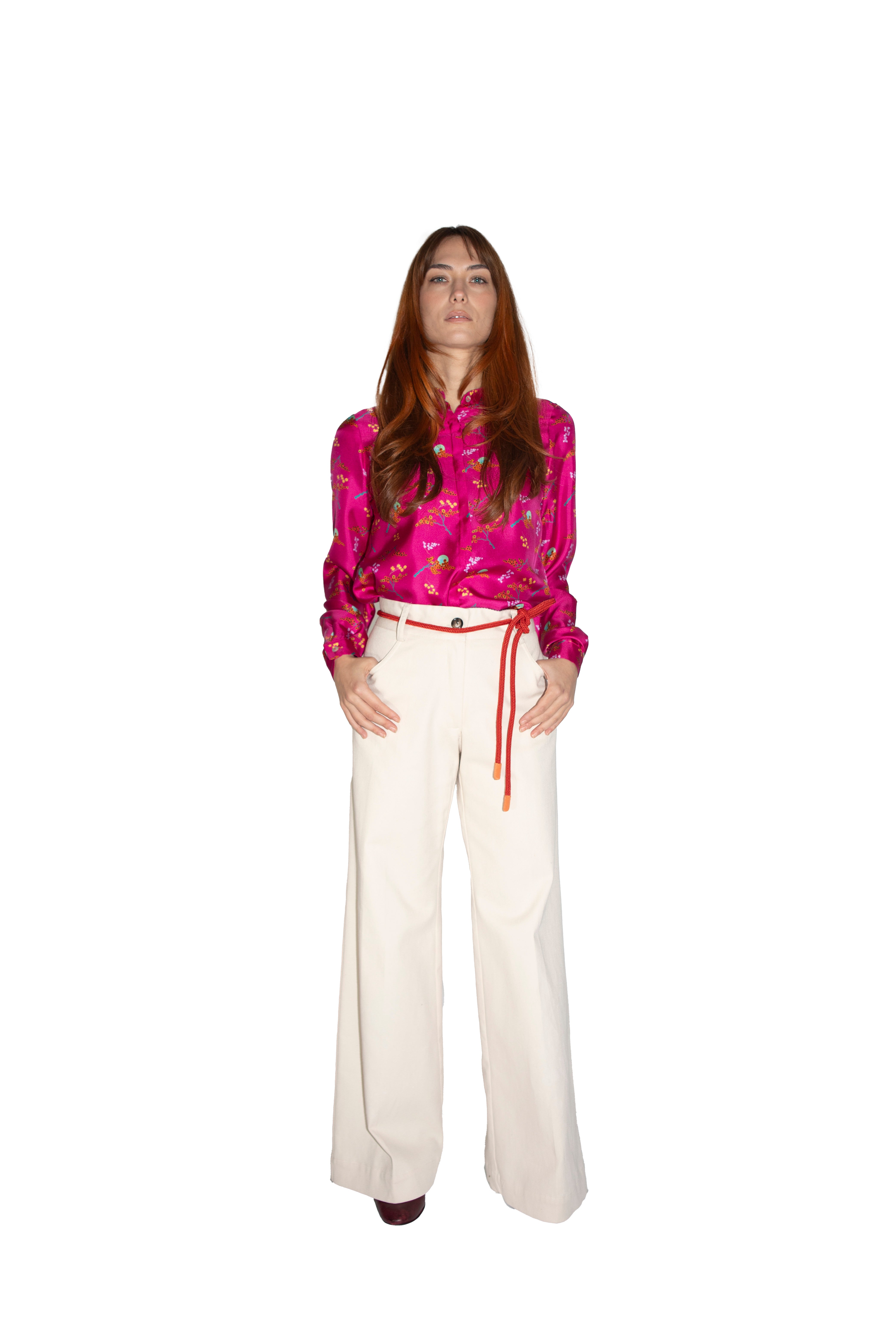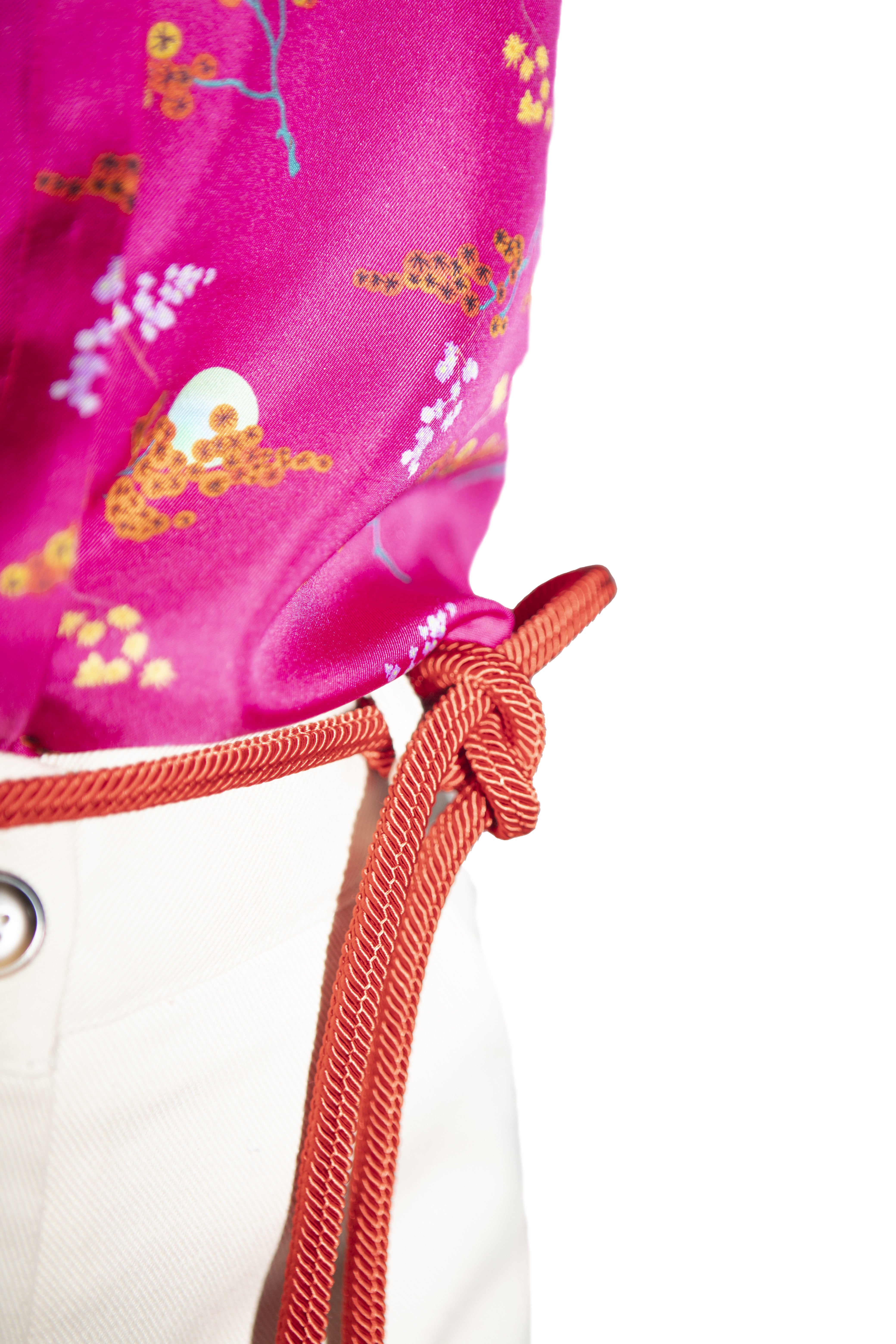 La Camicia Guru è realizzata in twill di pura seta e presenta la fantasia “I pini e la luna”, un disegno originale Paola Bizzi con fondo rosa scuro. La stampa trae ispirazione dai giardini giapponesi e dal loro equilibrio tra natura e simbologia poetica. Il tessuto è stampato a Como, cuore della tradizione serica italiana, e ogni camicia è confezionata artigianalmente in Italia in piccole serie.
