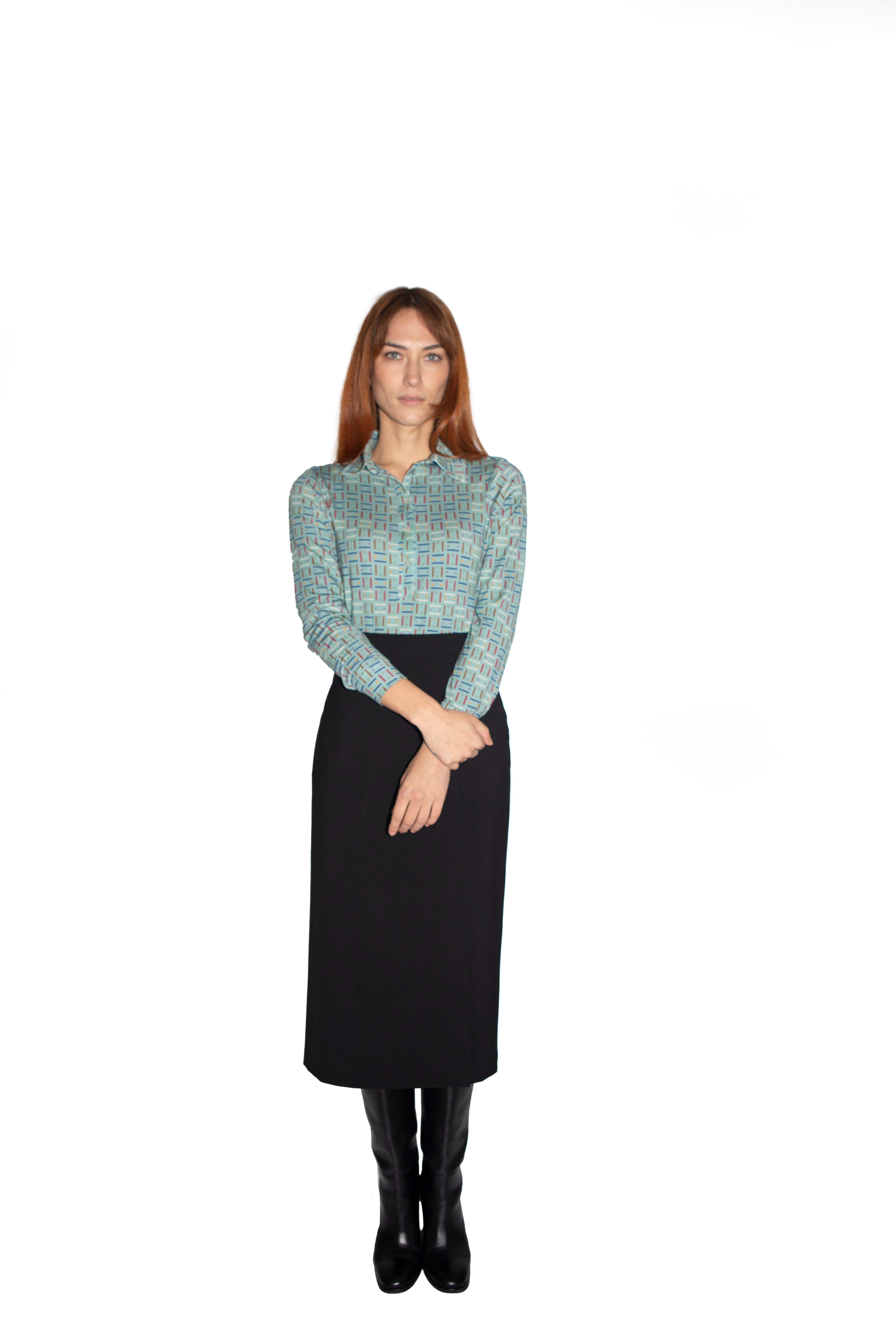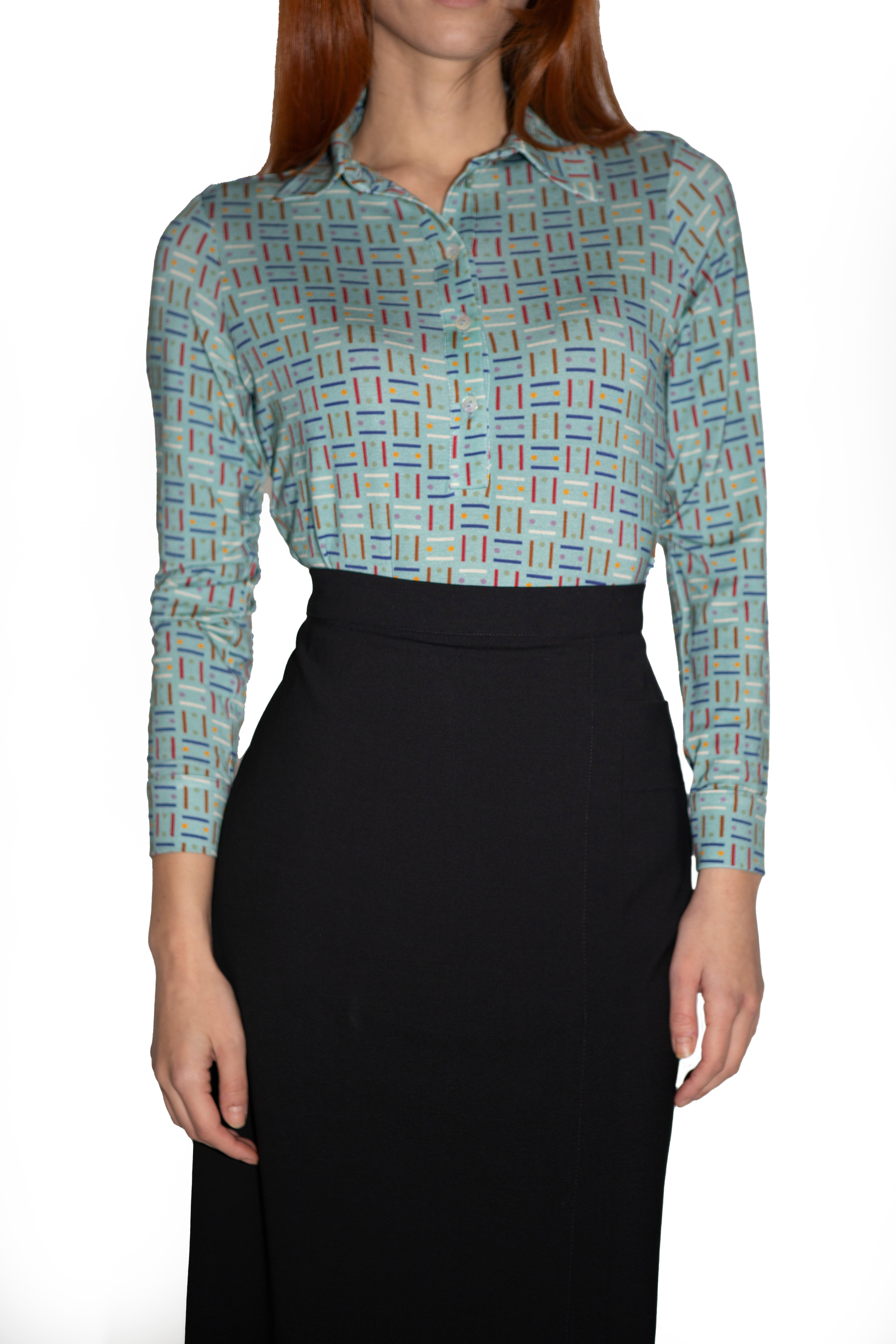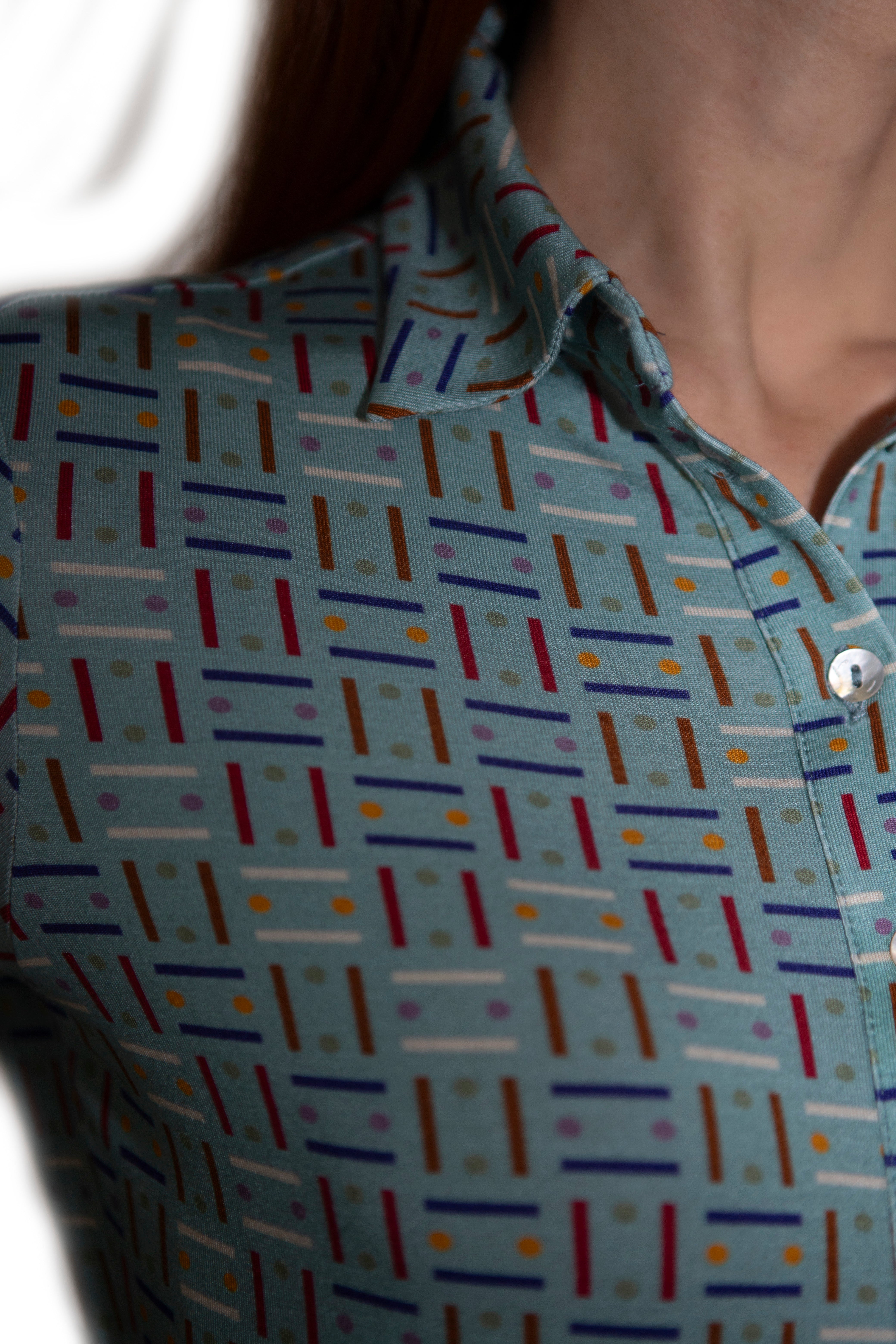 La Polo è realizzata in morbidissimo jersey di viscosa elasticizzato e presenta una stampa originale Paola Bizzi, ispirata a un antico disegno geometrico giapponese. Il motivo grafico, rivisitato nei colori contemporanei, è proposto su un elegante fondo acquamarina, che dona luminosità e movimento al capo. Il tessuto è stampato a Como, nel cuore della tradizione serica italiana, e ogni maglia è confezionata artigianalmente in Italia.